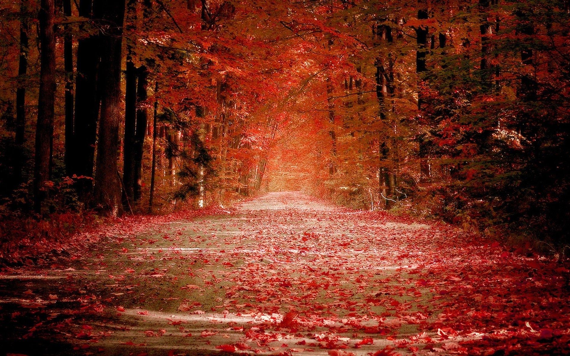 Route dans la forêt d'automne et la chute des feuilles rouges