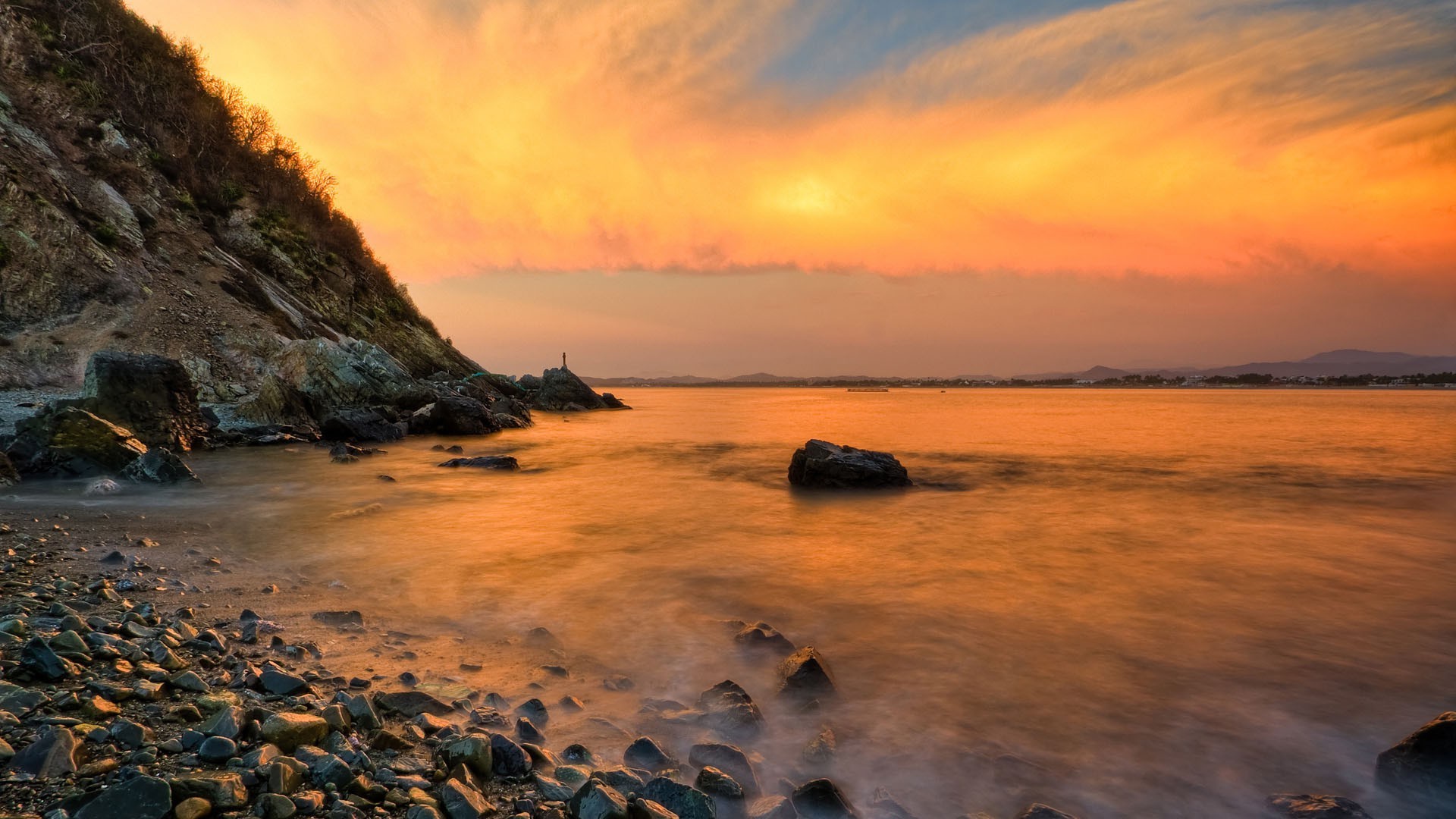 Coucher de soleil orange sur la côte rocheuse de la mer