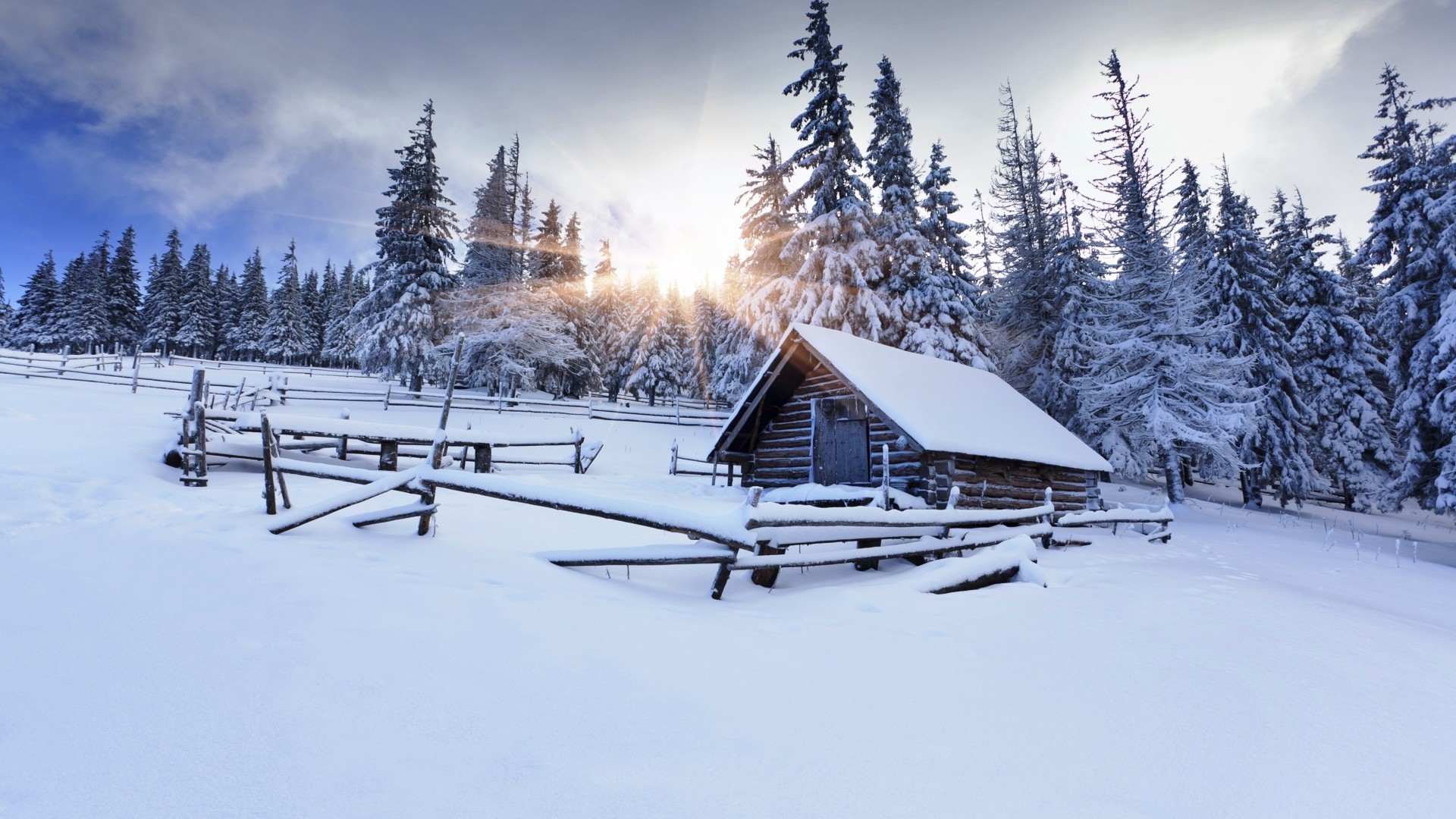 Vieille maison enneigée dans la forêt