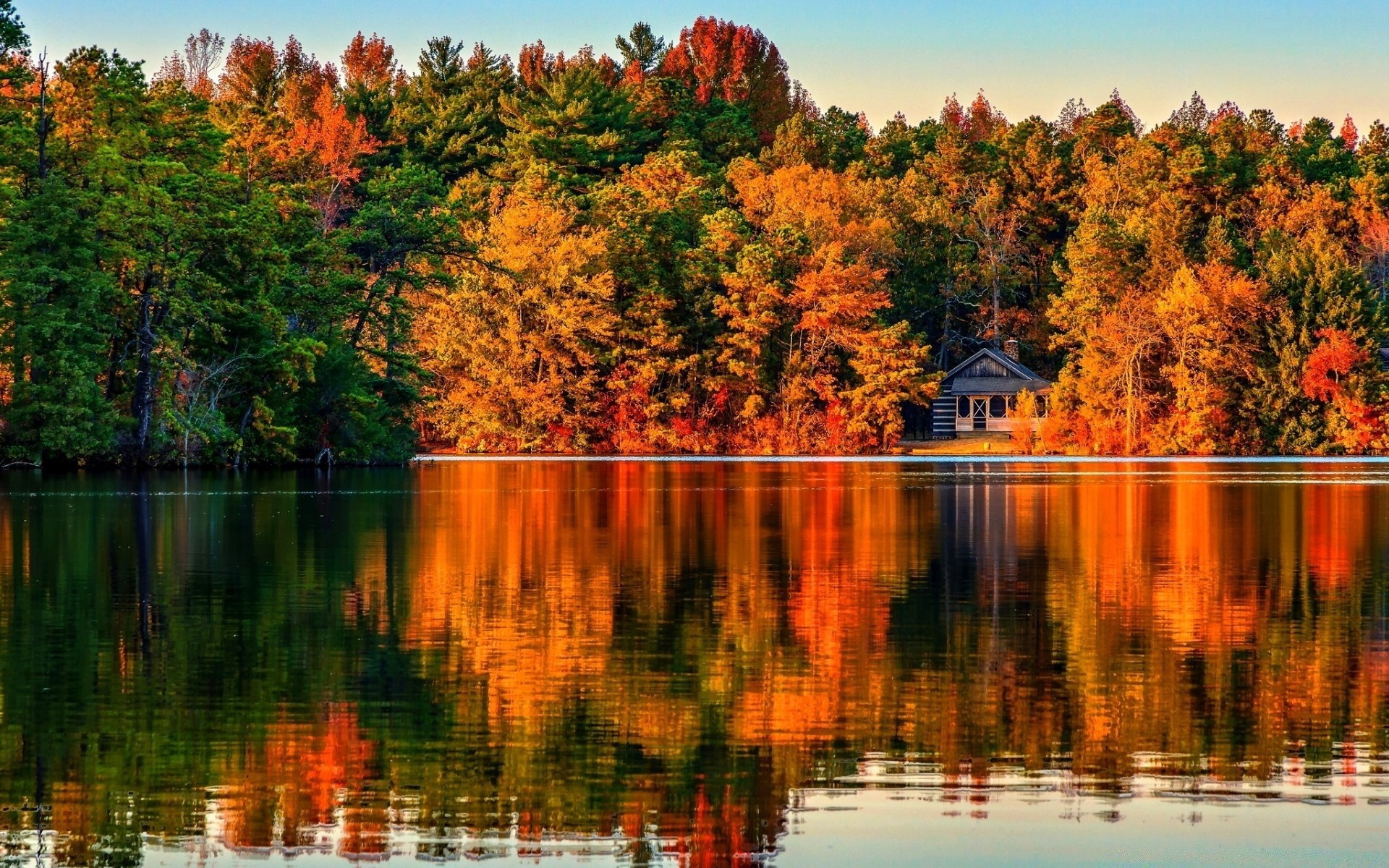 Nature automnale, arbres peints avec des couleurs vives, sur leur fond le lac