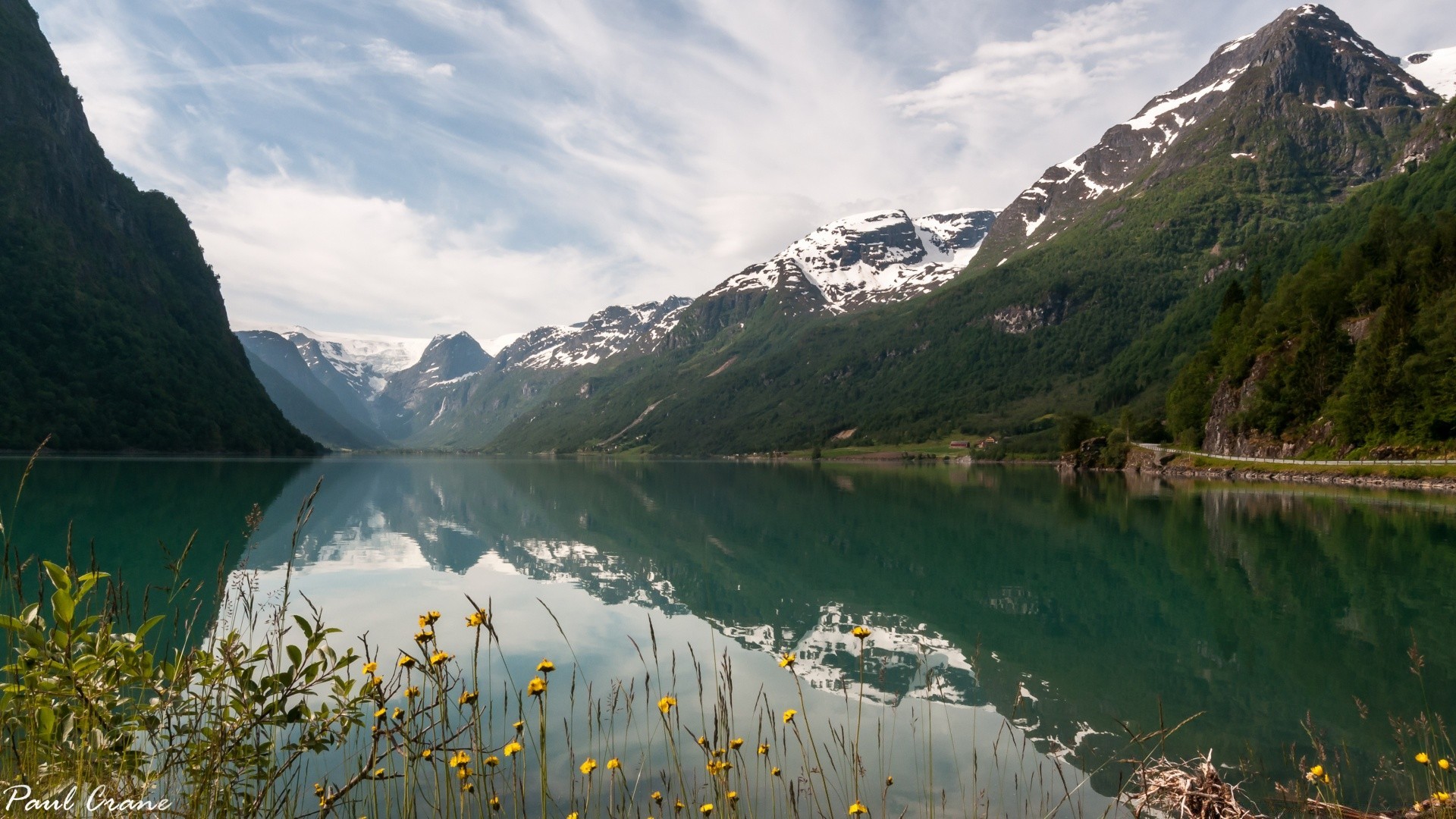 Paysage d'un grand lac autour de la forêt et au loin de la haute montagne