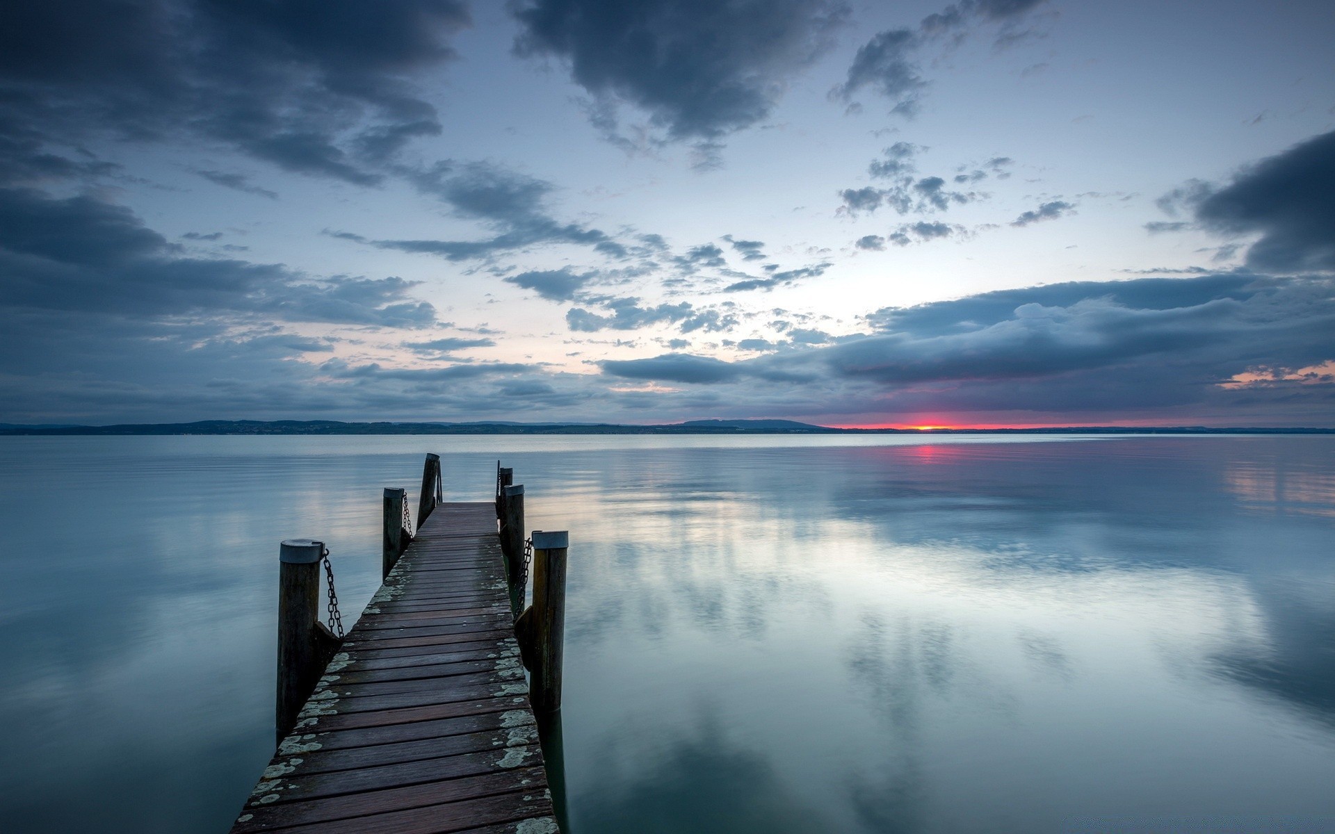 Côte herbeuse et lac avec ciel nuageux réfléchissant