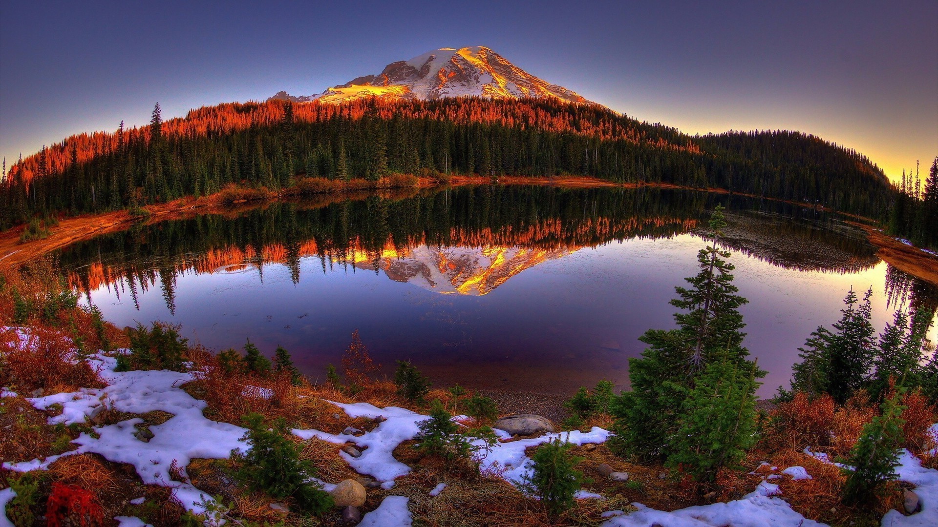 Coucher de soleil lumineux dans le reflet du lac