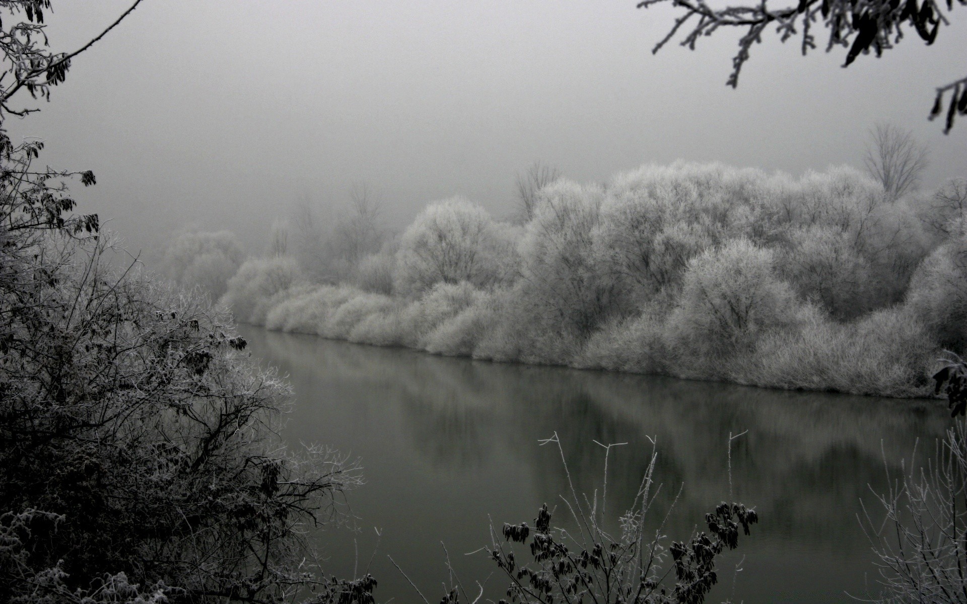 Forêt d'hiver avec lac dans le brouillard