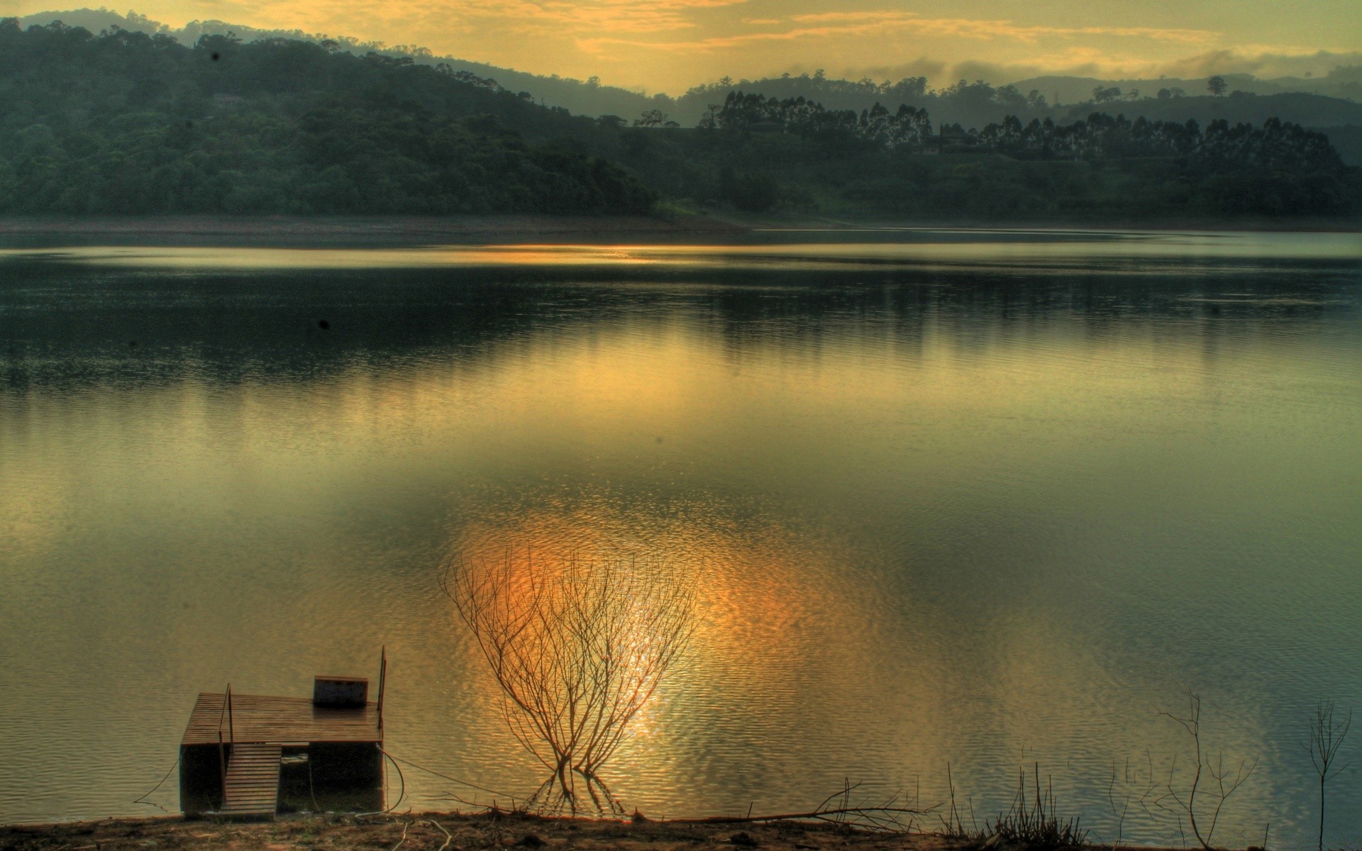 Arbre solitaire près du lac parmi les montagnes sur fond de coucher de soleilArbre solitaire près du lac parmi les montagnes sur fond de coucher de soleil