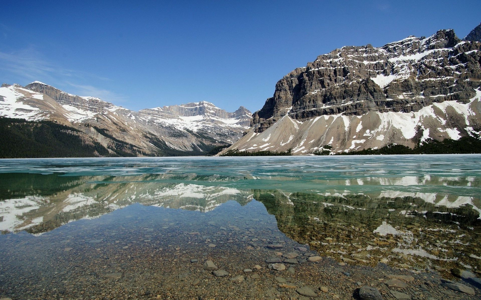 Reflet de la forêt et des montagnes dans le lac sur fond de ciel gris