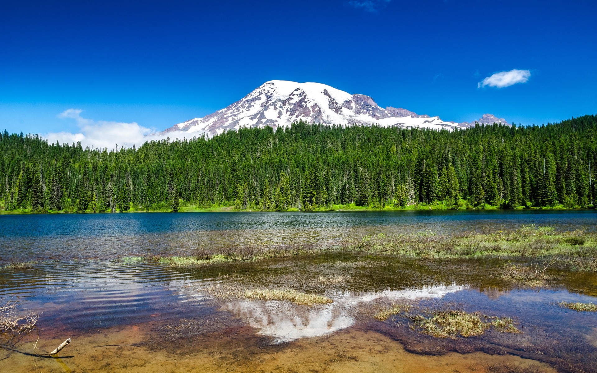 Montagne enneigée dans le ciel bleu entouré d'une forêt verte avec un lac