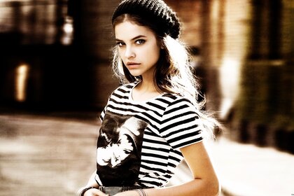 Fille en bonnet de laine et t - shirt rayé avec imprimé de la mode