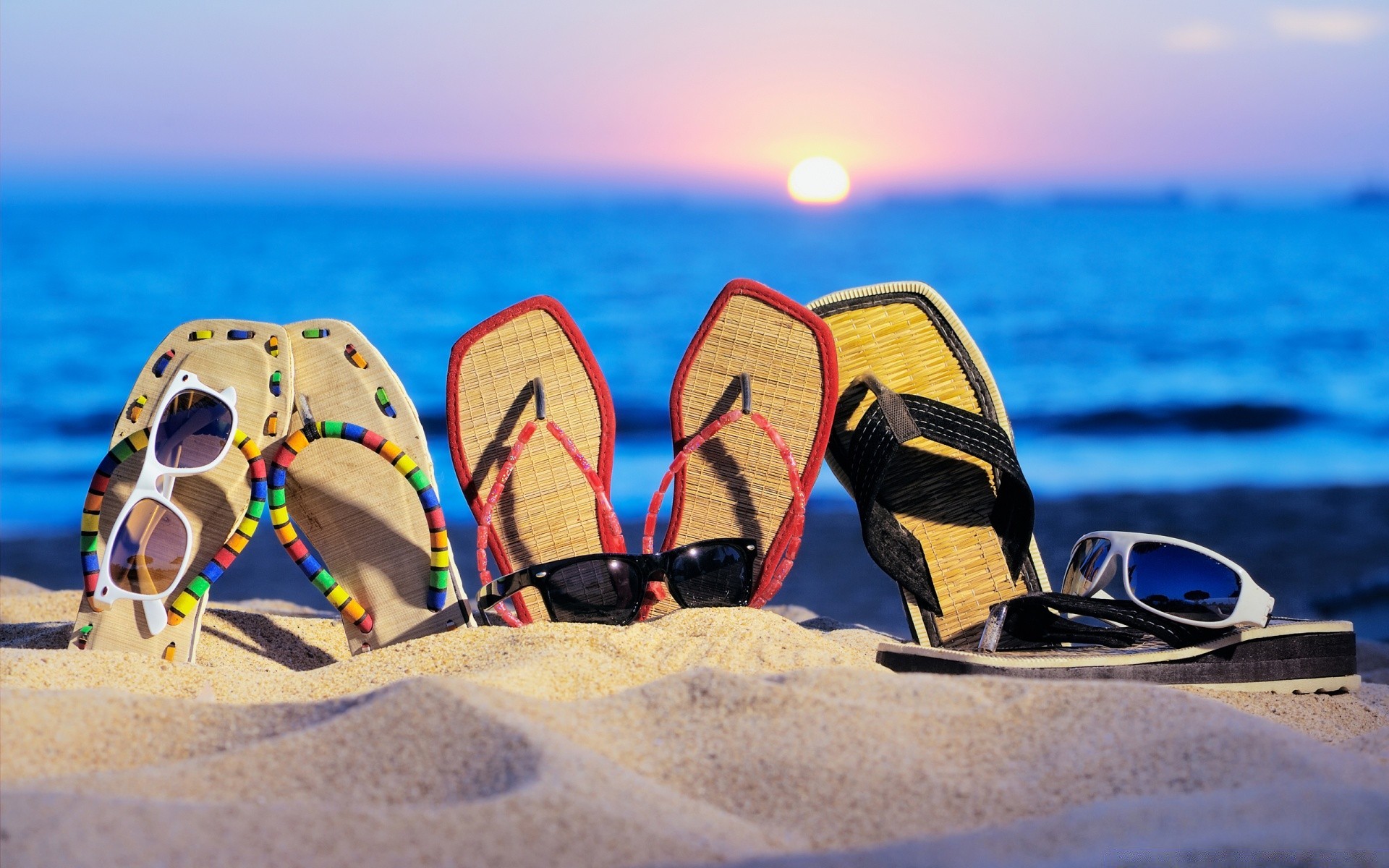 Pantoufles, lunettes dans le sable sur fond de coucher de soleil