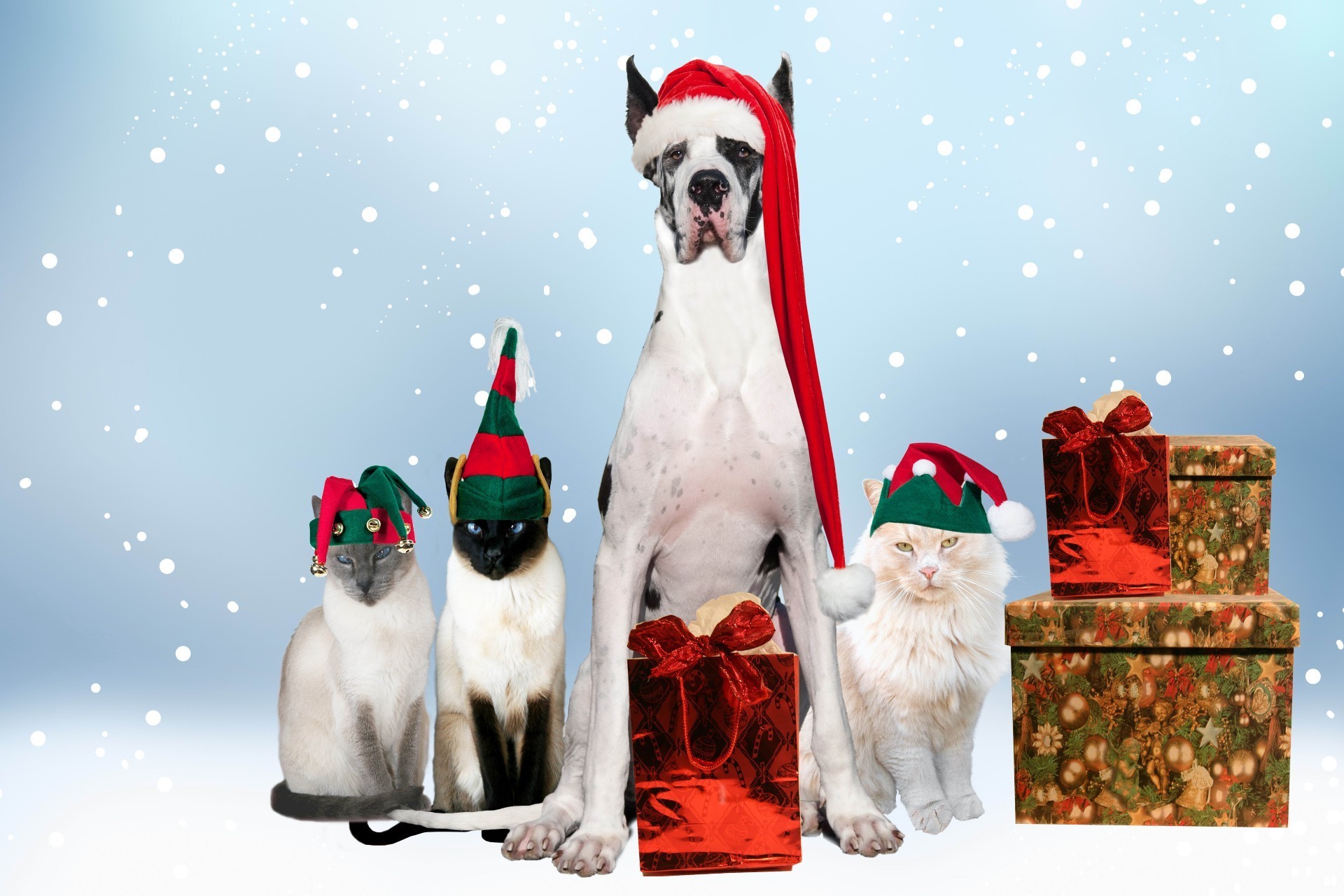 Grand chien à côté des chats et des cadeaux du nouvel an