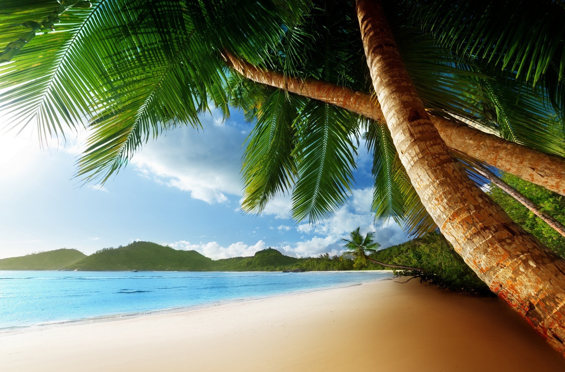 Un coin de paradis d'une île tropicale avec une plage de sable fin et des palmiers