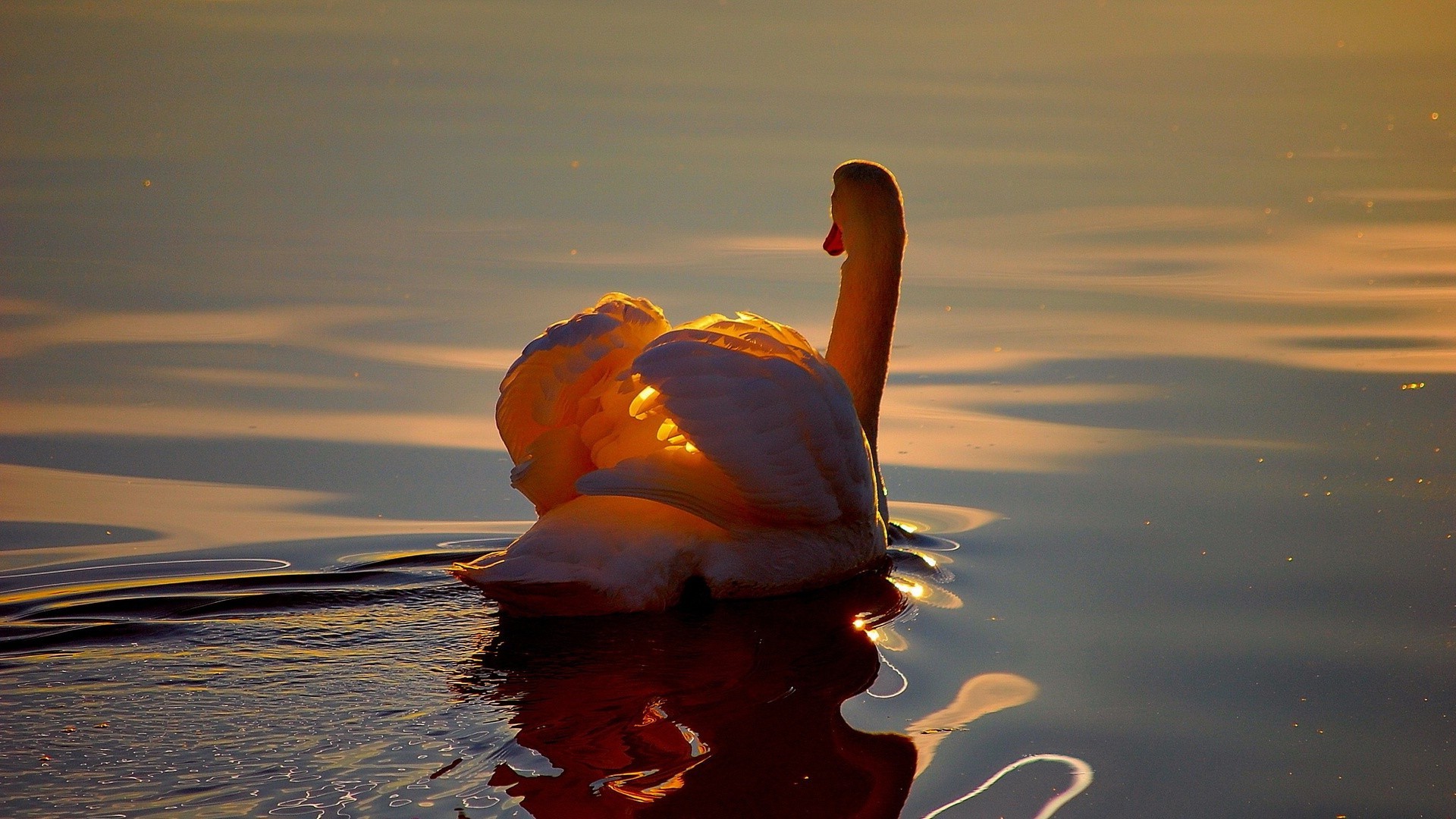 Cygne blanc nage dans les rayons du coucher du soleil