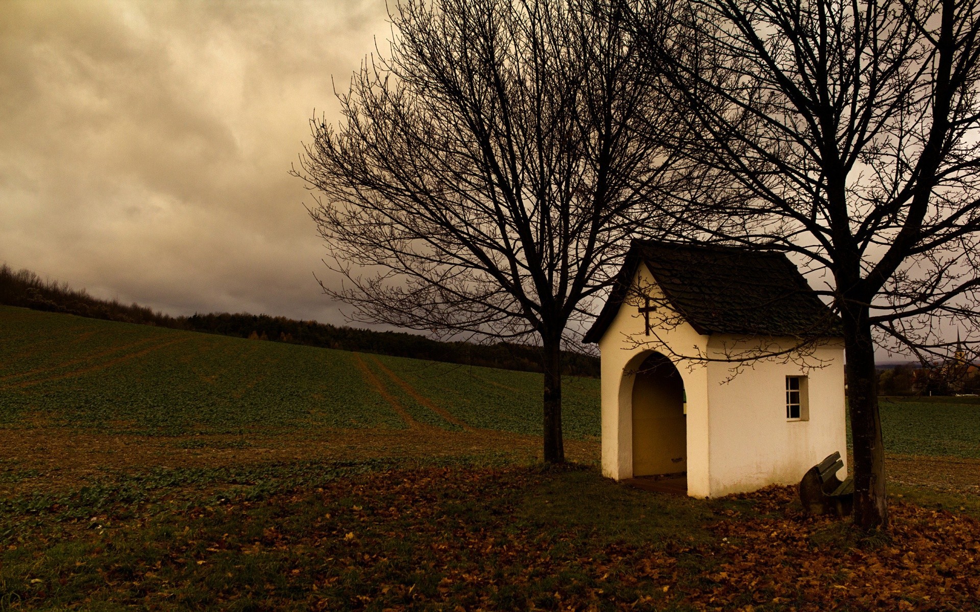 Grange de paysage d'automne entre les arbres sous un ciel nuageux