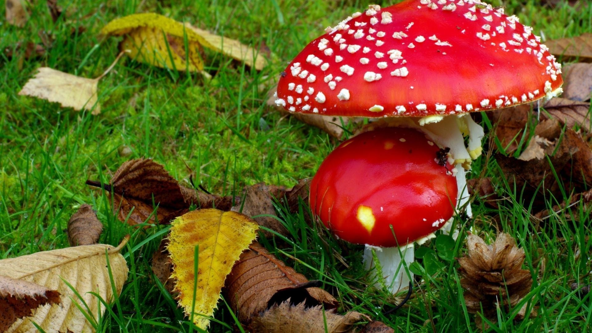 Champignons dans l'herbe verte et les feuilles d'automneChampignons dans l'herbe verte et les feuilles d'automne