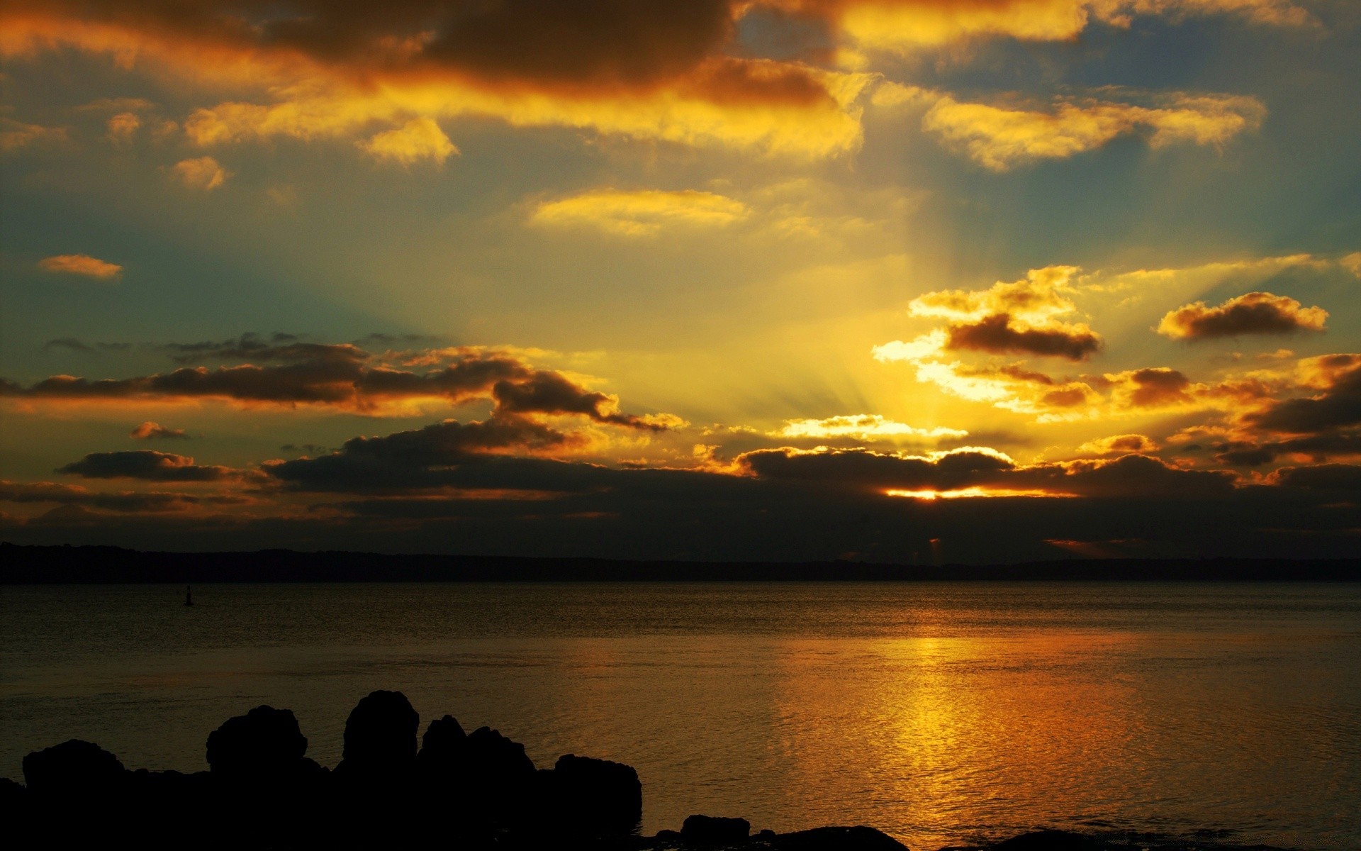 Beau coucher de soleil sur la mer calme, les rayons du soleil couchant peint la surface de l'eau et les nuages en couleur dorée