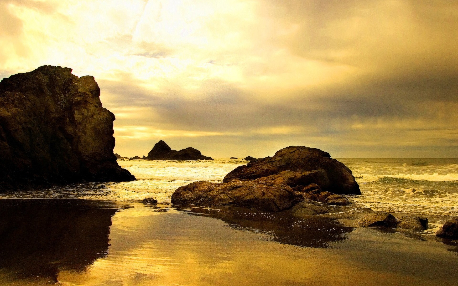 Gros rochers dans la mousse de la mer au coucher du soleil