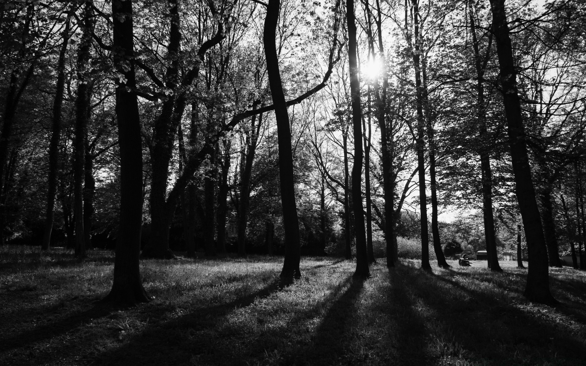 Forêt avec des lueurs ensoleillées en noir et blanc