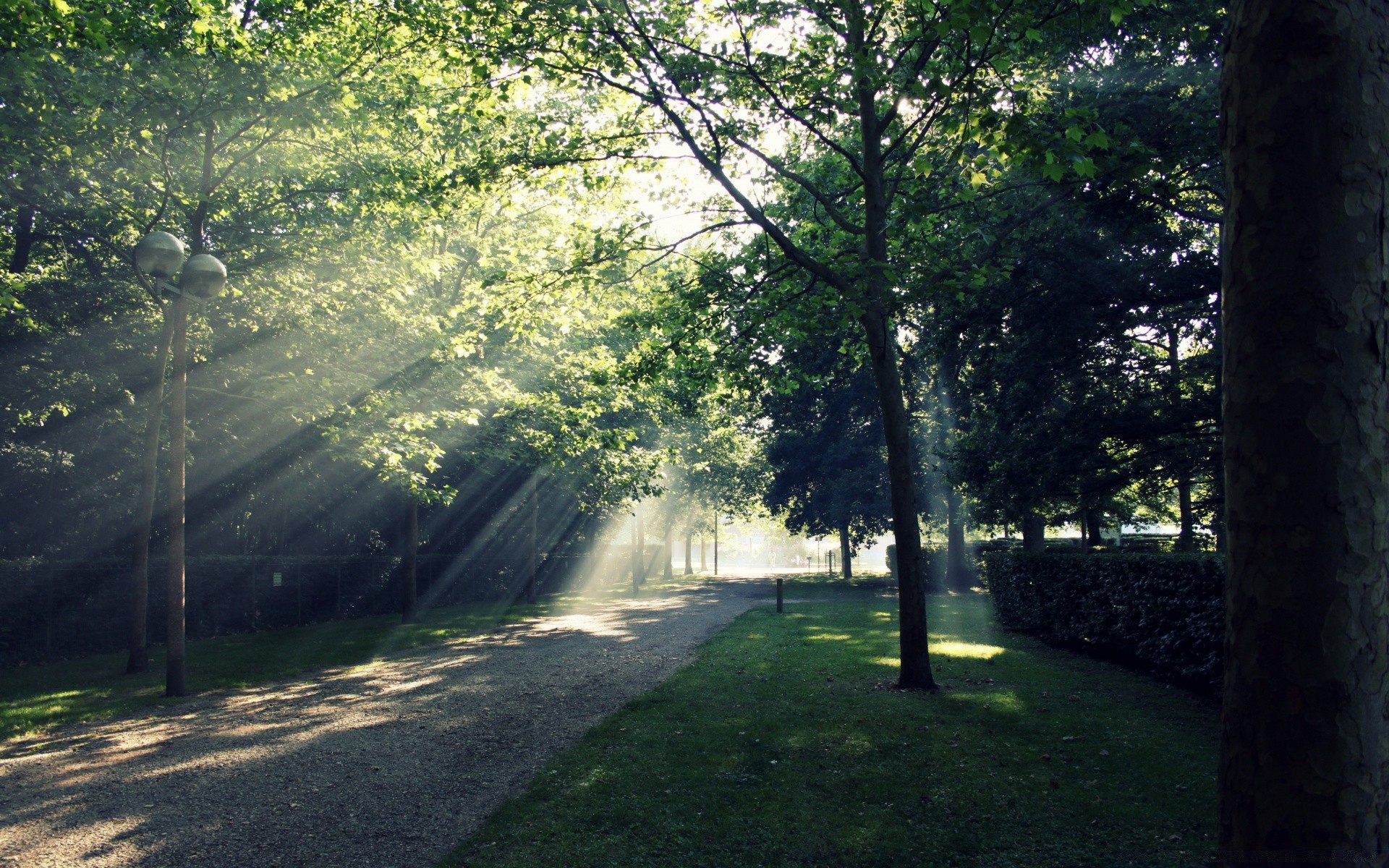 Chemin du parc éclairé par les rayons du soleil