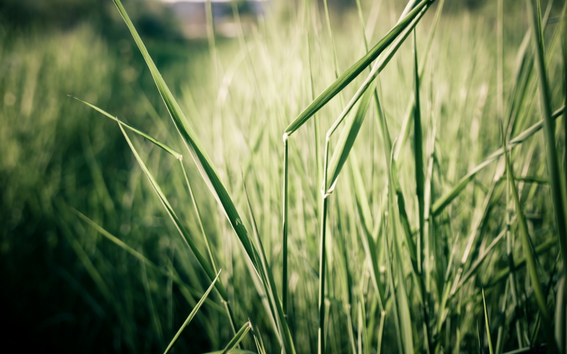 Macro d'une herbe verte ornée de gouttelettes de rosée
