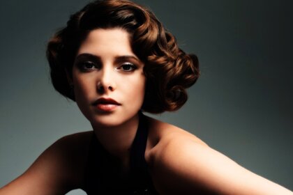 Femme avec une coiffure à la mode posant semi-assiseFemme avec une coiffure à la mode posant semi-assise