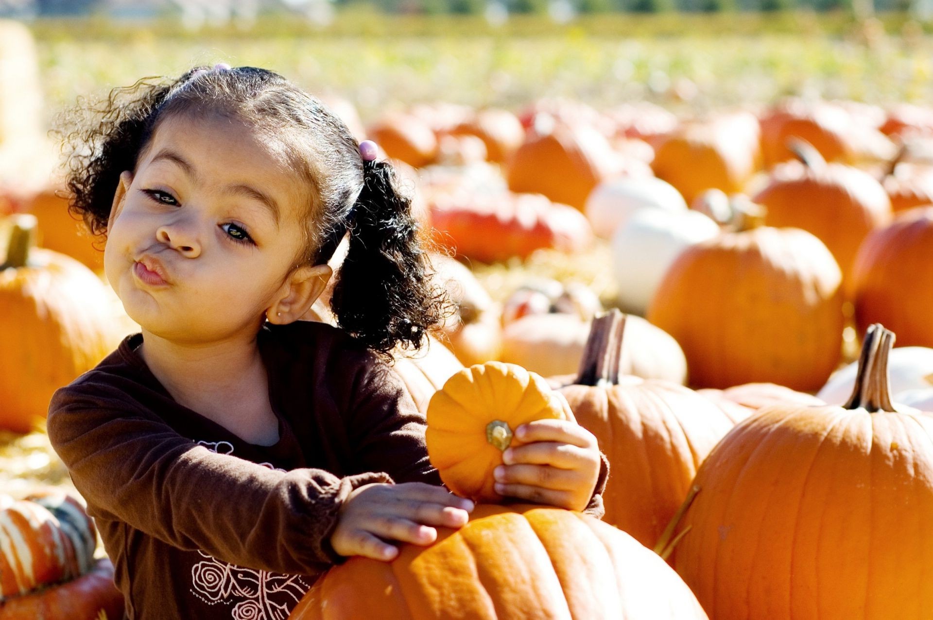 Un enfant qui est assis sur des citrouilles et tient aussi une citrouille dans sa main