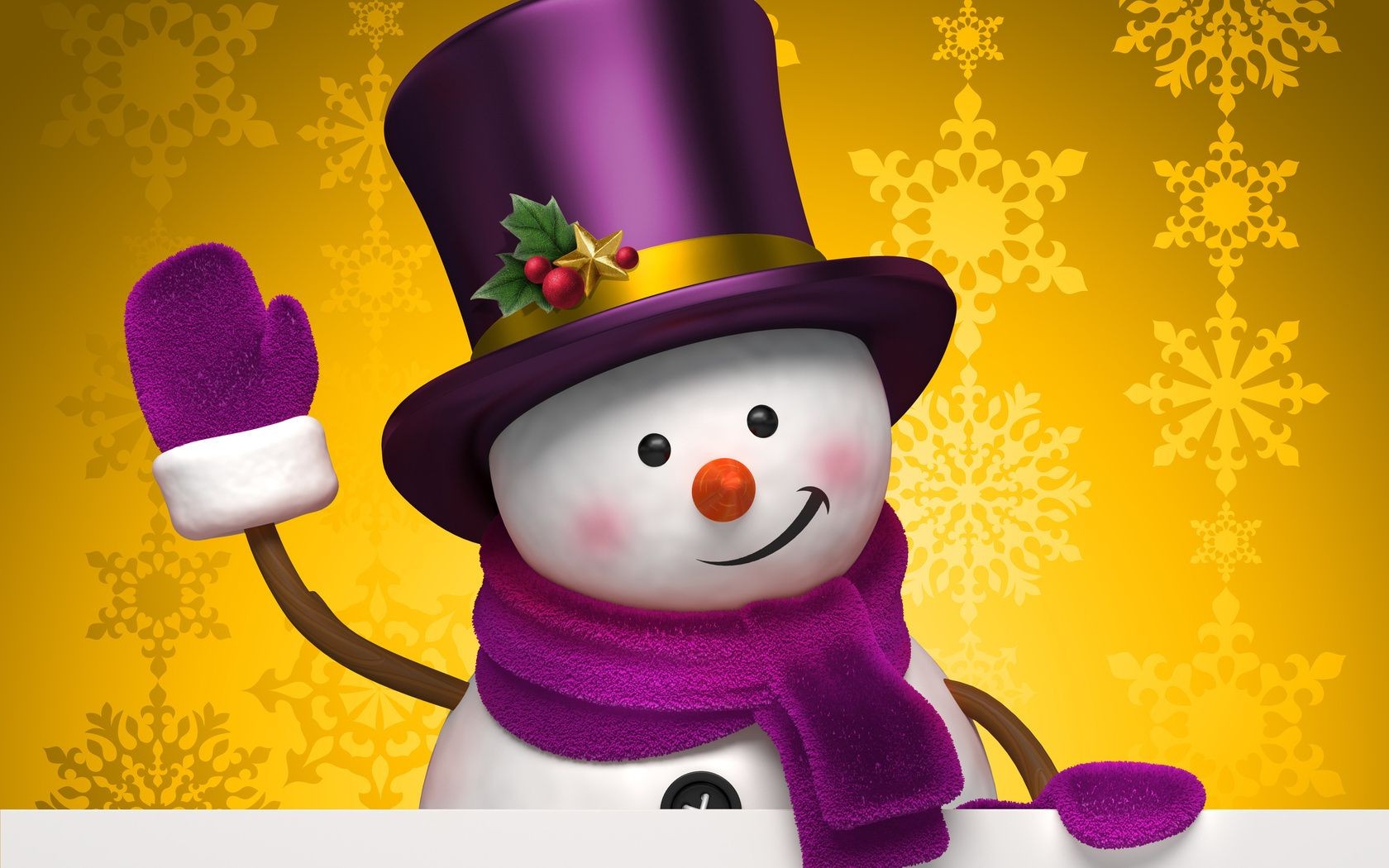 Le Nouvel an. Bonhomme de neige souriant dans un chapeau et une écharpe. Bonhomme de neige agitant sa main dans la mitaine