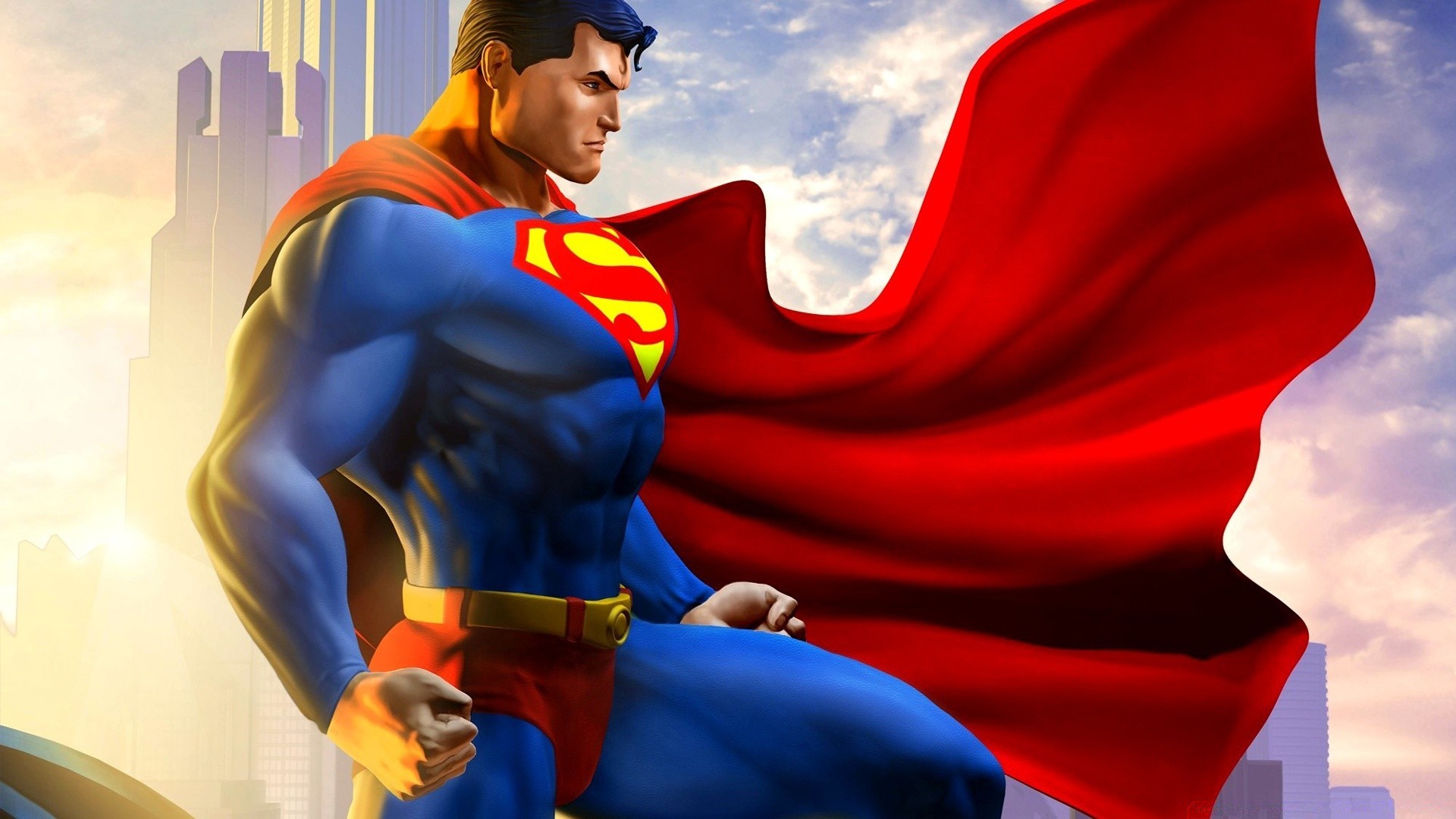 Superman dans un manteau rouge flottant sur le fond des gratte-ciel de la métropole