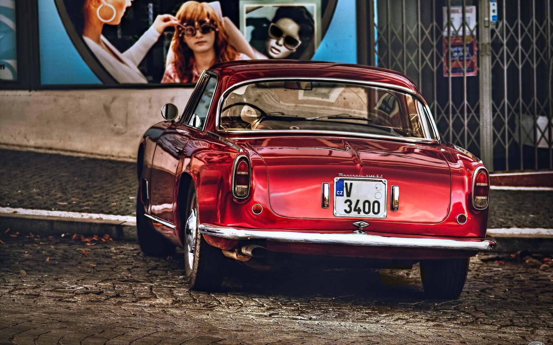Voiture rétro rouge sur les pavés