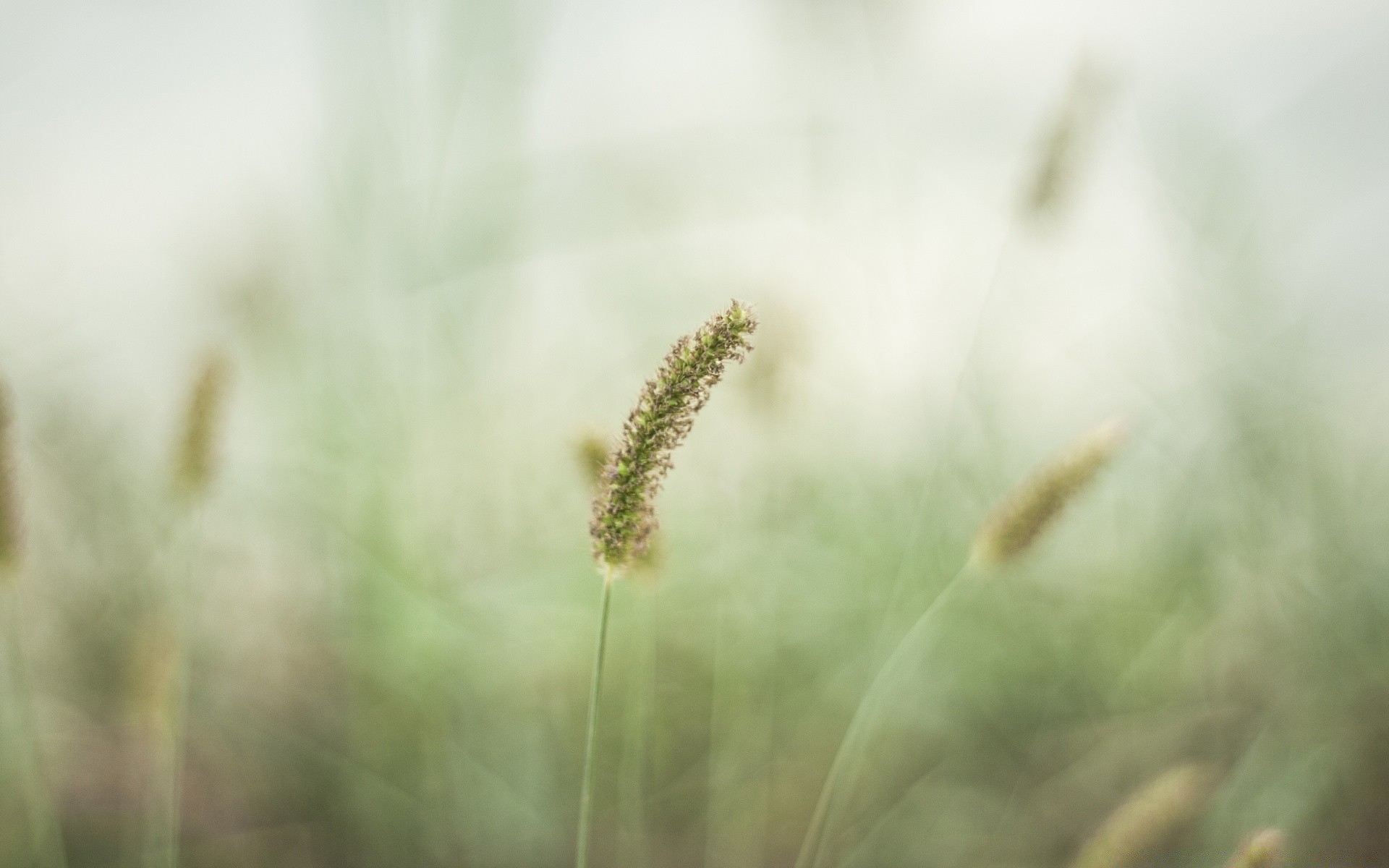 Coucher de soleil sur le lac couvert d'herbe et de petites fleurs