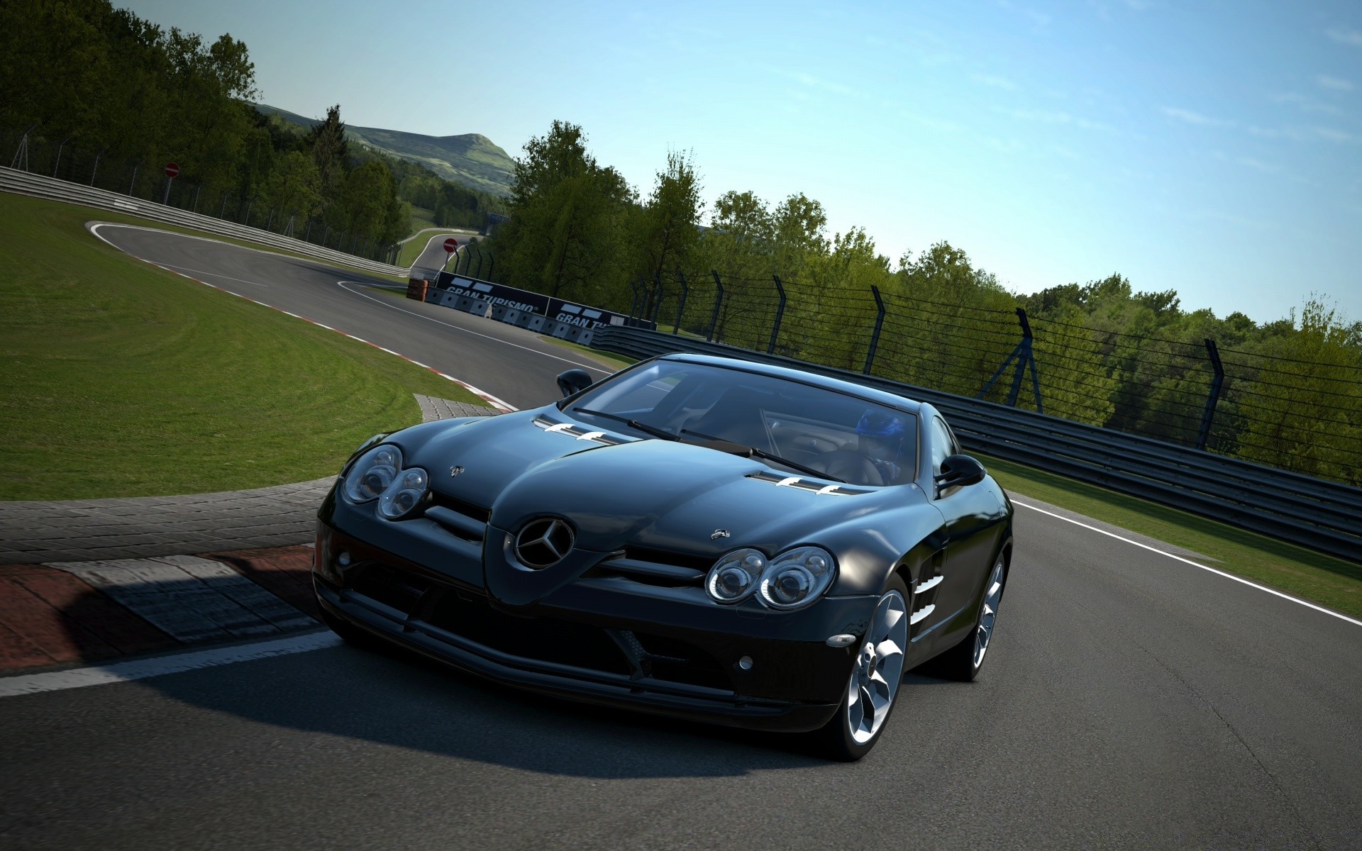 Mercedes noire sur l'asphalte plat par une journée ensoleillée