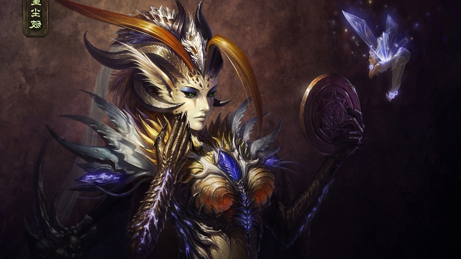 Fantastique anime fille sorcière avec des cornes regarde dans le miroirFantastique anime fille sorcière avec des cornes regarde dans le miroir