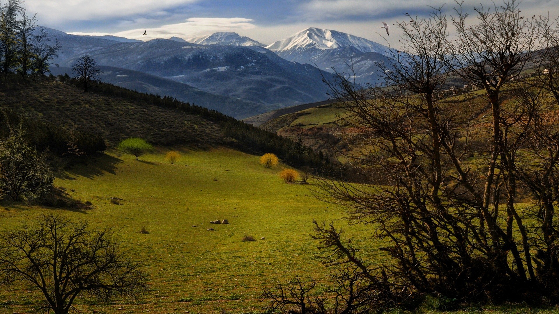 Longue plage de sable sur la côte avec de hauts bâtiments et des montagnes