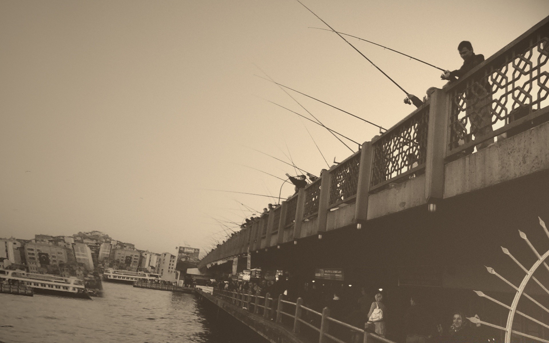 Pêcheurs de pêche avec un pont dans la ville