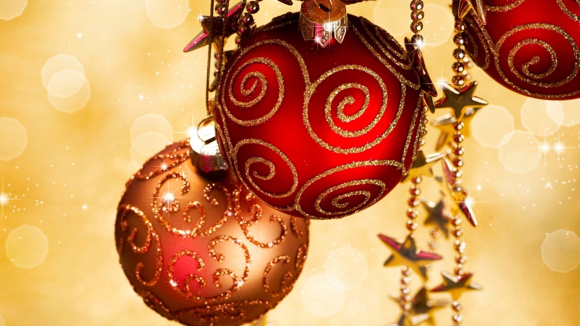 Carte de Noël boules rouges sur fond d'or avec des lanternes