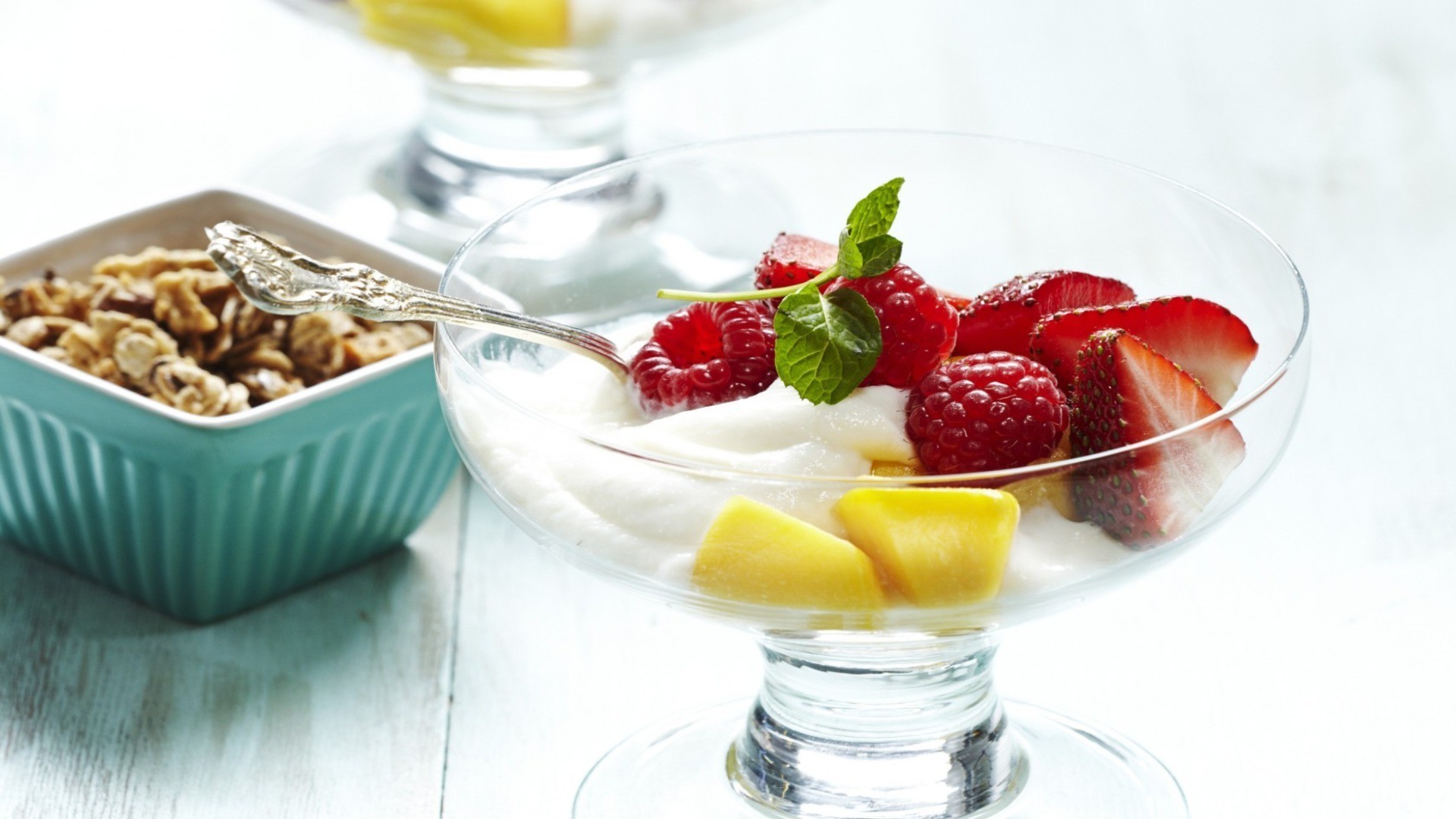 Mousse sucrée avec des noix et des morceaux de fraises dans un verre crémant