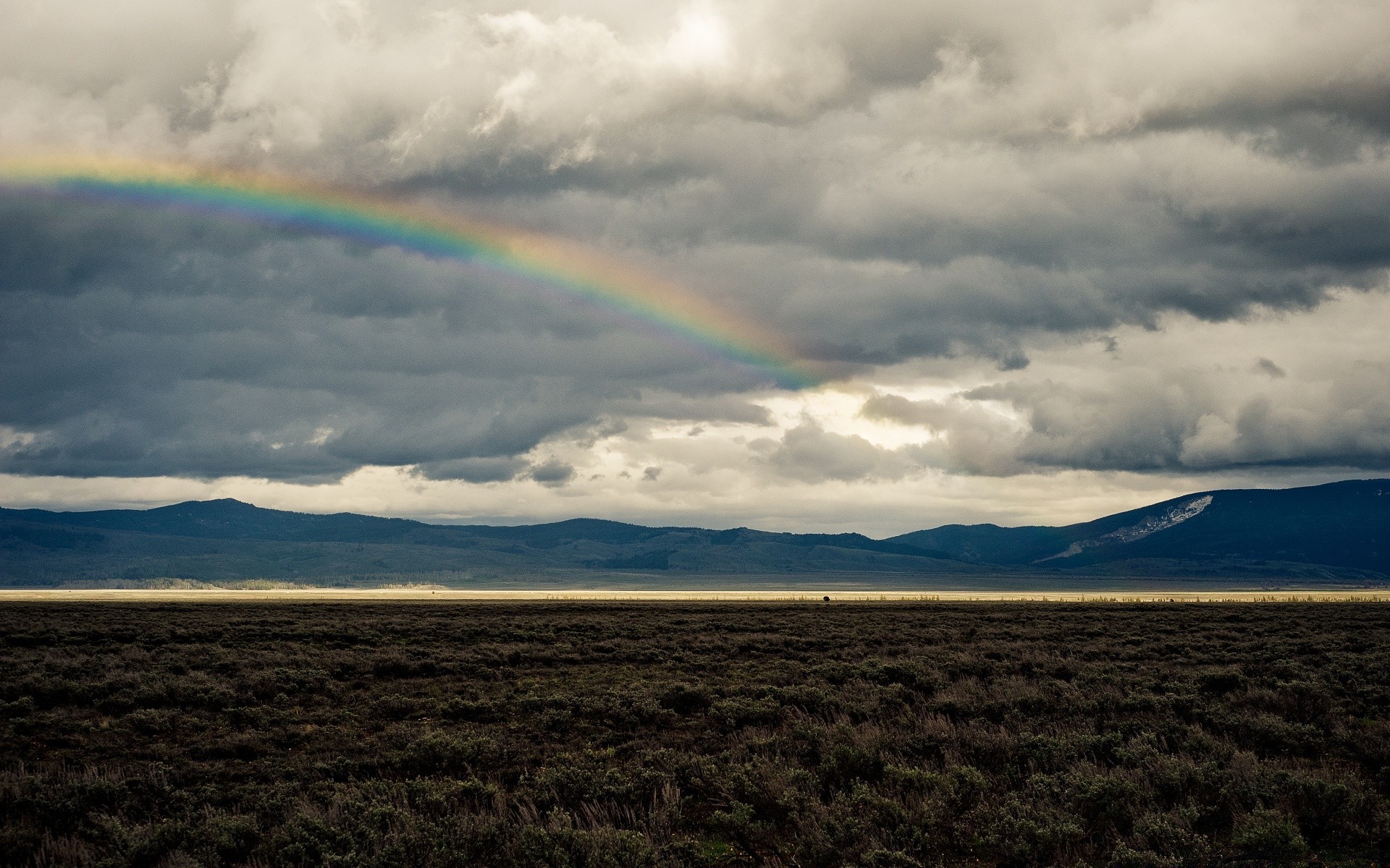 Arc-en-ciel au coucher du soleil dans un champ vallonné