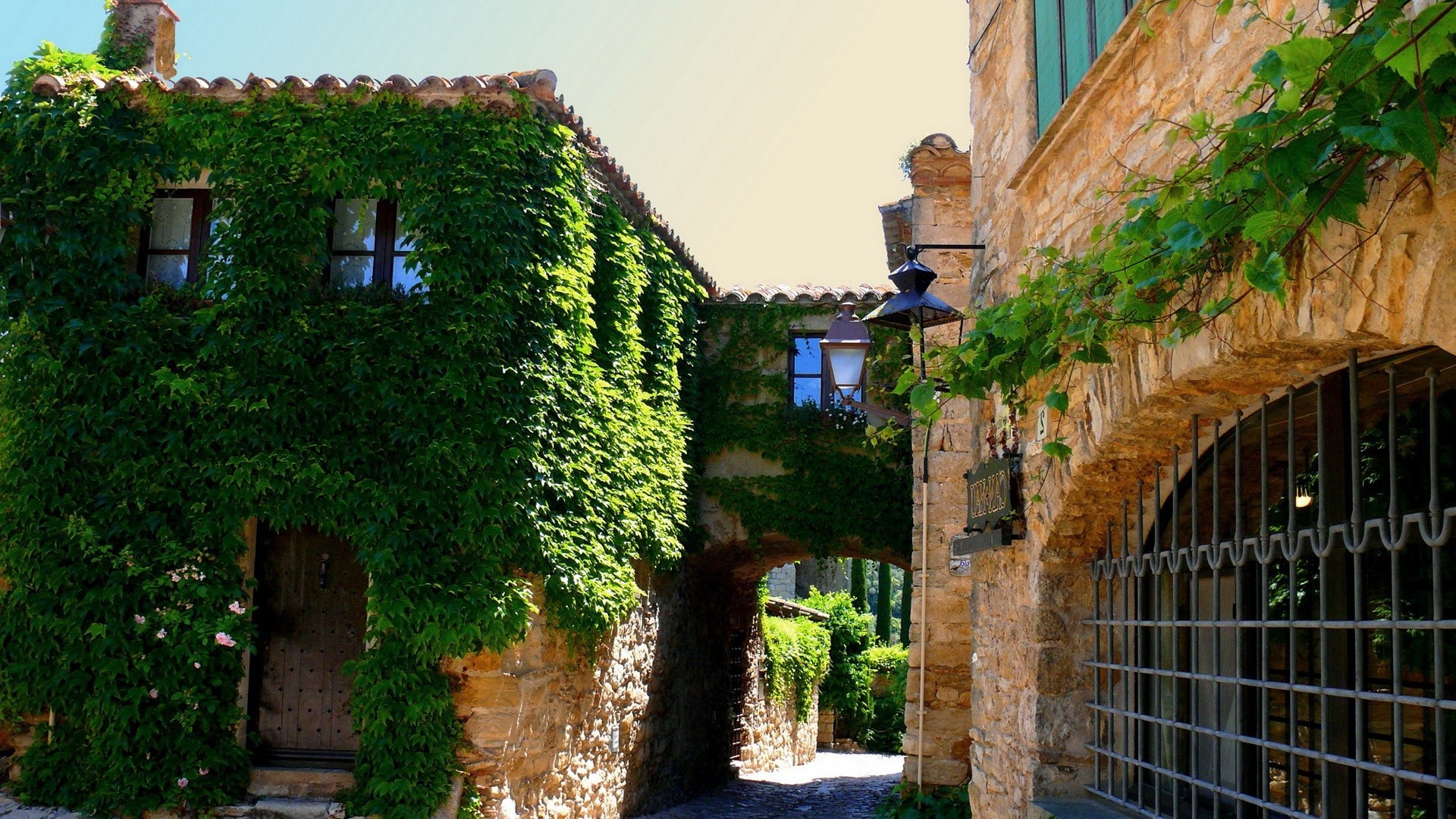 Maison en brique envahie par le lierre frais avec des portes sculptées et forgées