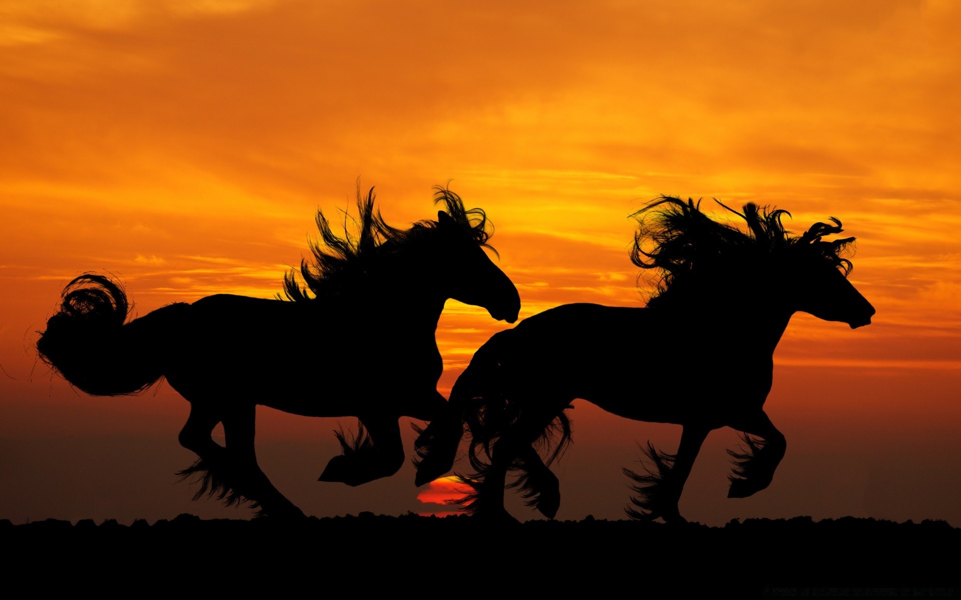 Au coucher du soleil, on voit des silhouettes de chevaux