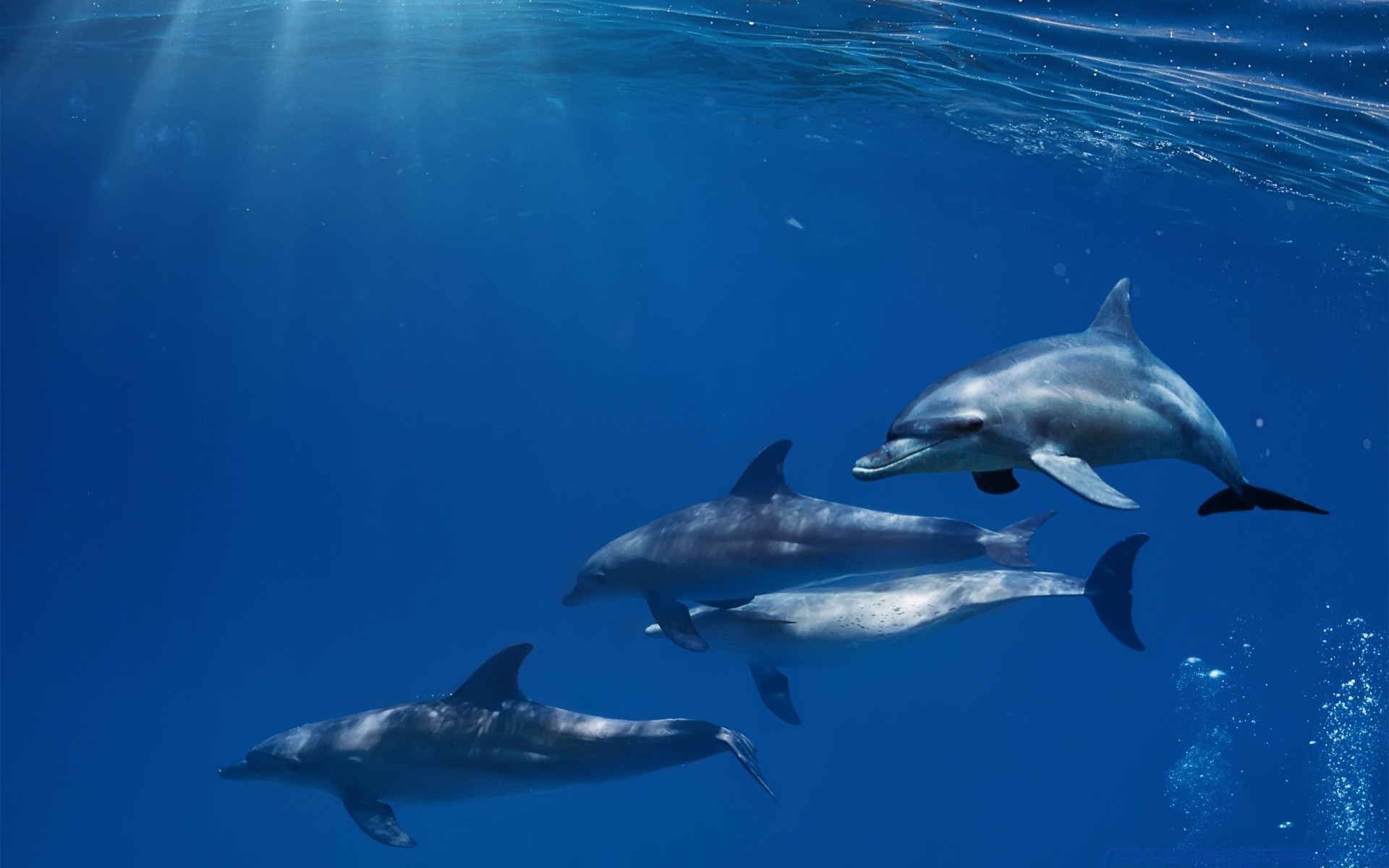 Quatre dauphins nagent dans la mer bleue et claireQuatre dauphins nagent dans la mer bleue et claire