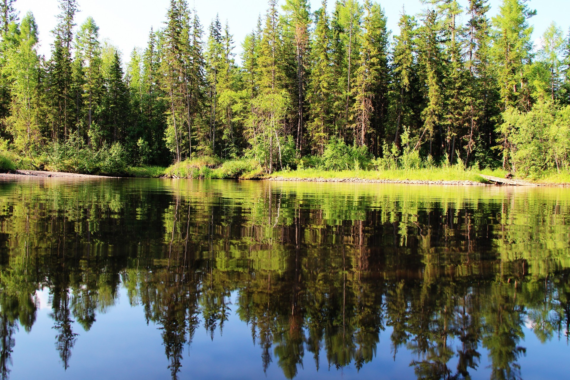 Paysage de lac avec reflet de la haute forêt et des montagnes