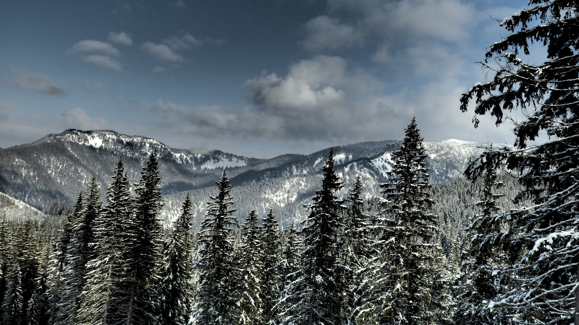 Sapins séculaires enneigés sur fond de montagnes