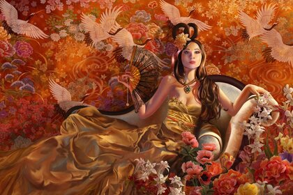 Fille en robe de soie dorée et avec un ventilateur dans les mains, couché sur le canapé sur fond d'écran avec des grues japonaises et des fleursFille en robe de soie dorée et avec un ventilateur dans les mains, couché sur le canapé sur fond d'écran avec des grues japonaises et des fleurs