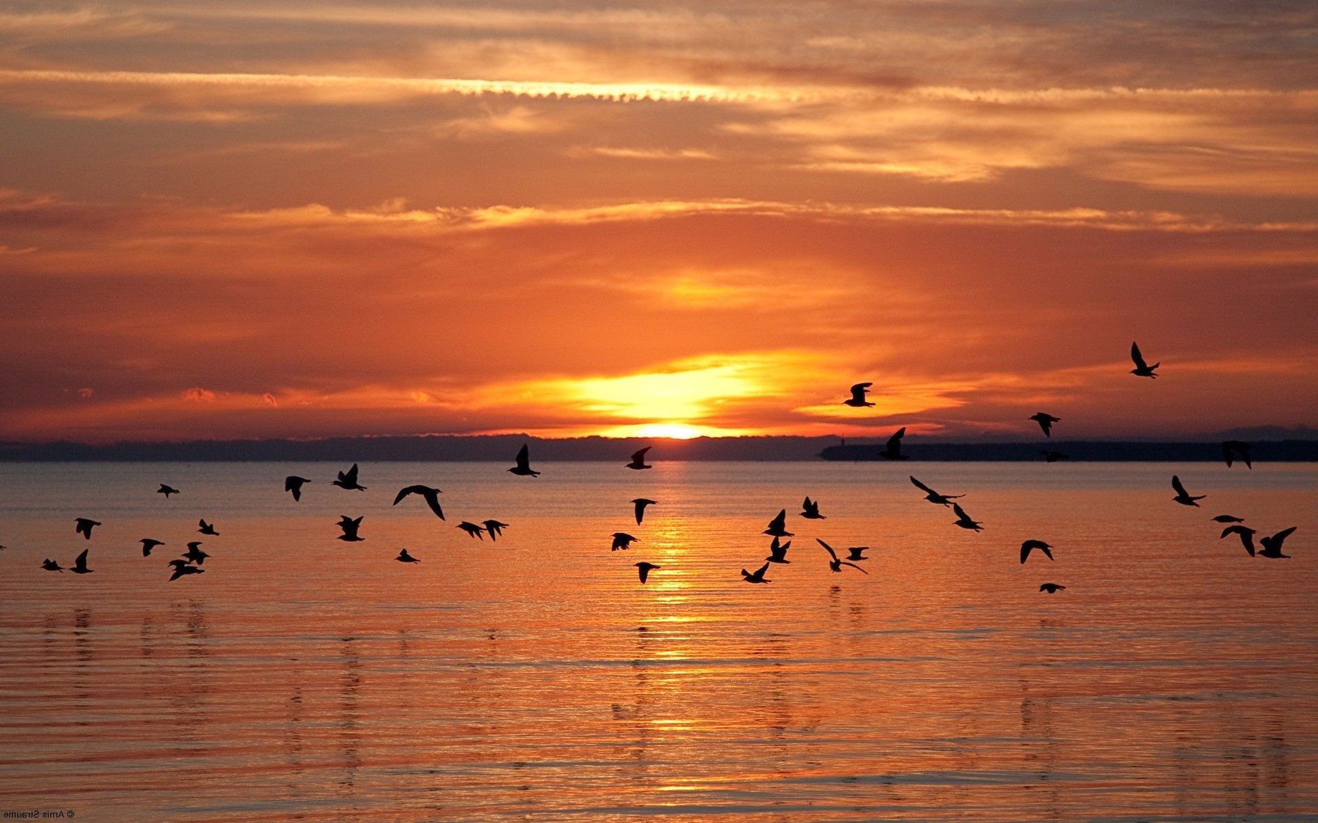 Oiseaux volent au-dessus de l'eau sur fond de coucher de soleil