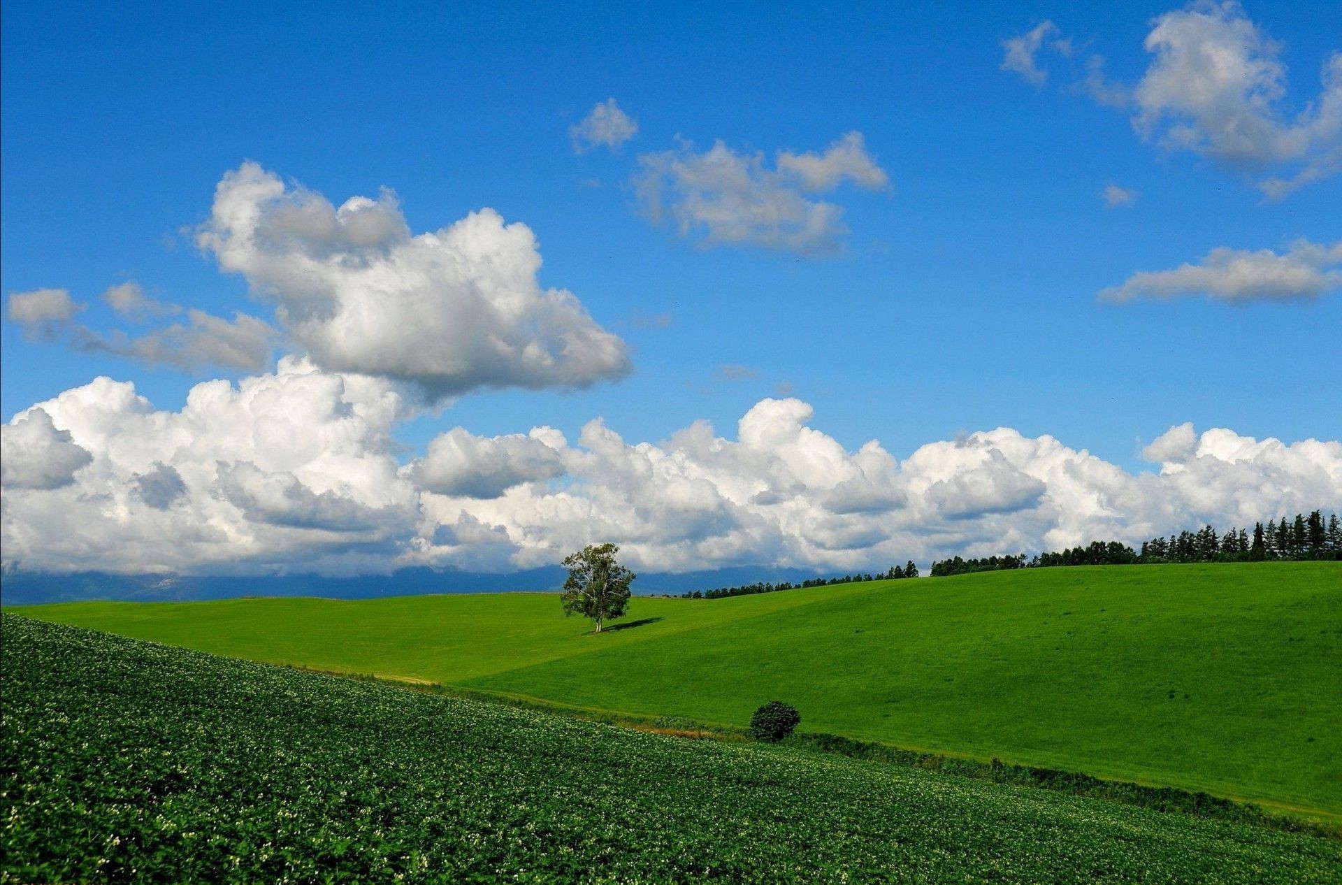 Champ d'été de nuages verts et blancs sur le ciel bleu
