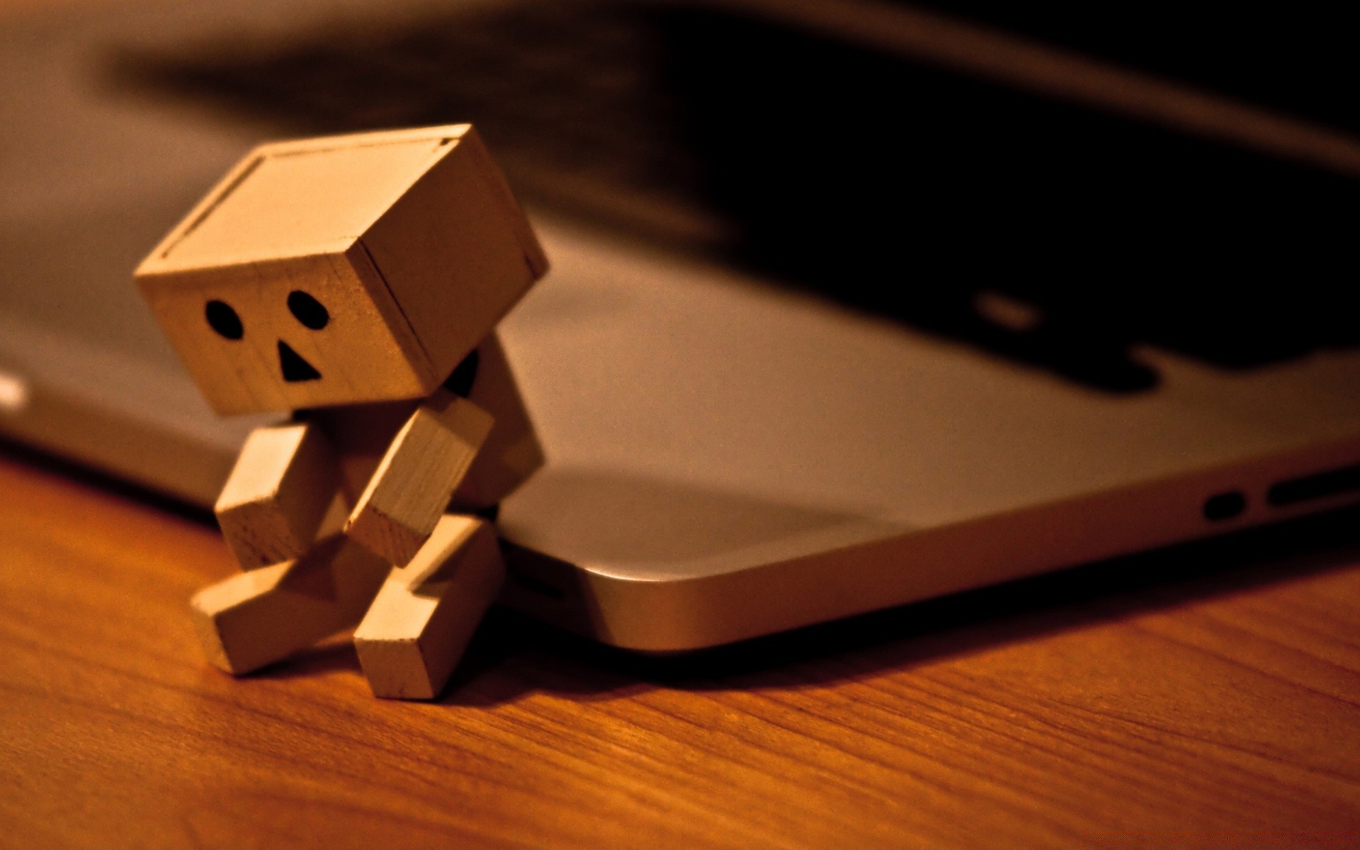 Homme en bois triste assis sur un ordinateur portableHomme en bois triste assis sur un ordinateur portable