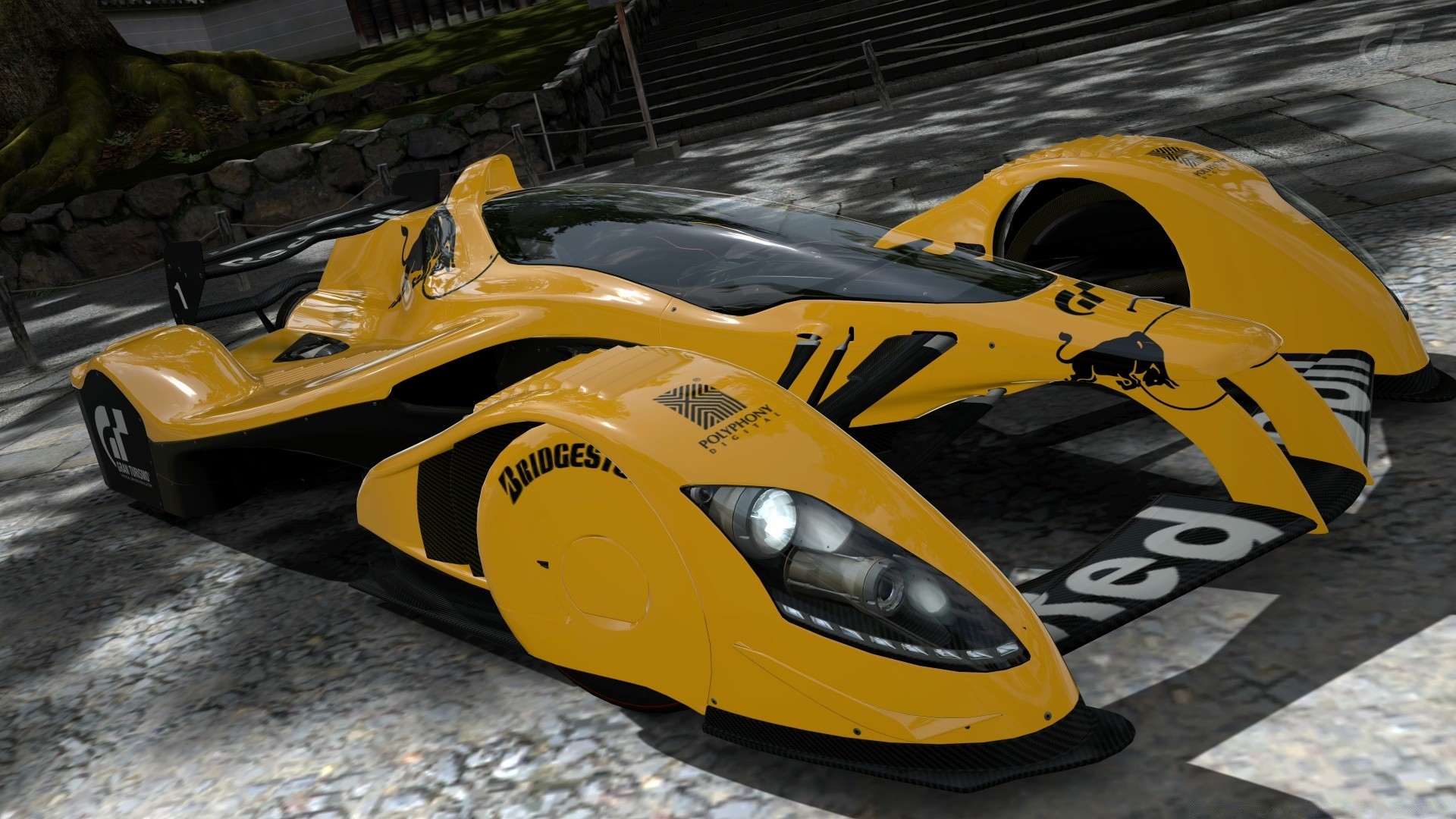 Voiture de course jaune sur fond d'amphithéâtre dans le jeu d'ordinateur gran turismo