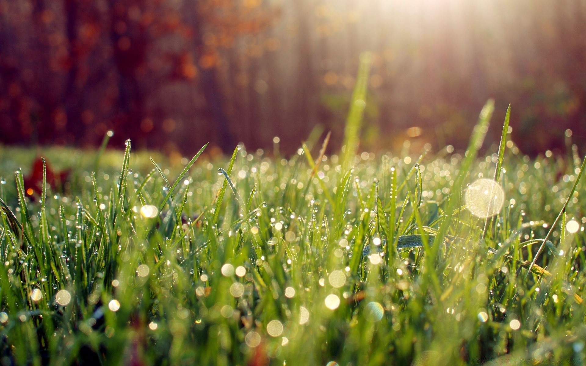 Gouttes de rosée irisées sur l'herbe à la lumière du jour