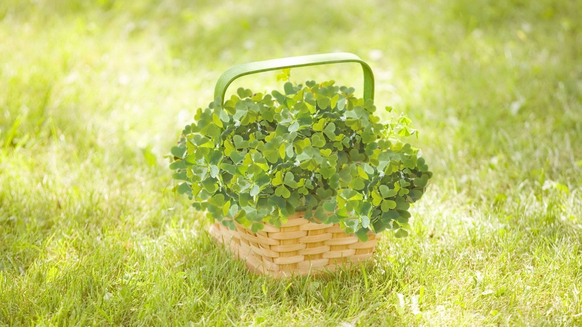 Panier en osier avec de la verdure sur l'herbe. Beau paysage rural