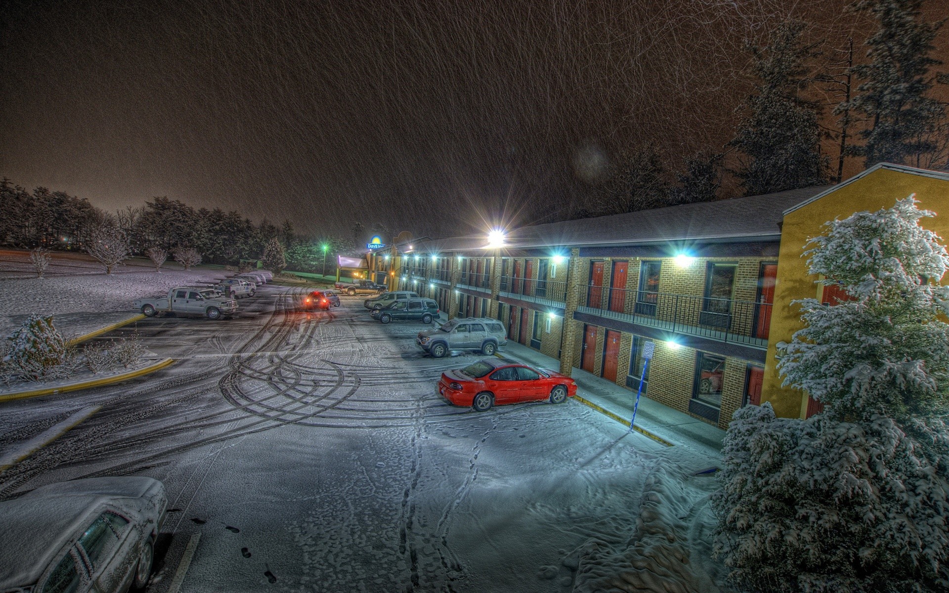 Hélicoptère endormi, voiture sur terre, paysage de nuit