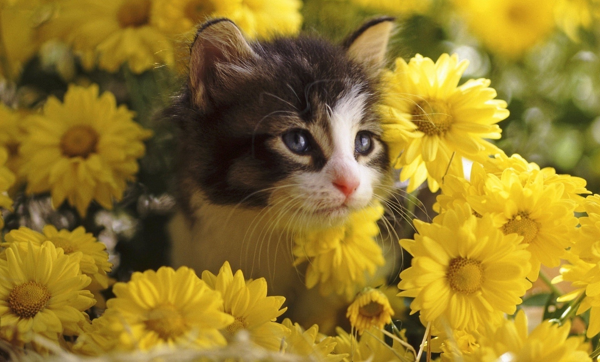 Chaton regarde attentivement d'un bouquet de fleurs jaunes